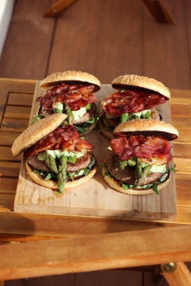 4 Rindfleisch Bürger Patties guter Qualität je 150g, 250g Schwarzwälder Schinken in Scheiben, 4 Bürgerbrötchen, 500 g grüner Spargel, 1 Bund frische Rucola, 50g Butter, Salz und Pfeffer aus der Mühle.