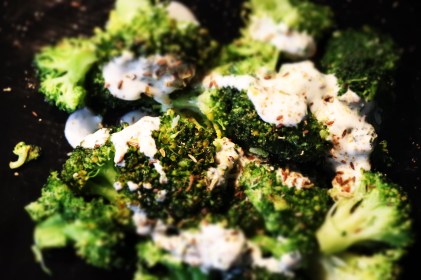 Brokkoli auf Tellern verteilen, mit würzige Jogurtsauce garnieren und mit frisch gemahlenen Gewürzen bestreuen.
