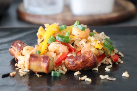 Jambalaya auf Tellern verteilen und mit frisch gehacktem Schnittlauch garnieren.