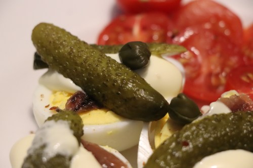 Zutaten: 6 Bioeir Große M, Majonäse, 4-5 Sardellenfilets in Öl, 8 Pfeffer Cornichons, 8 Kapern, Cherry Tomaten.