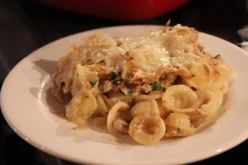 Nudeln (Orecchiette) 500 g, Butter 100 g, 1-2 Zwiebeln, Champignons braun 300 g, 1 Glas Tuna in Olivenöl, Kartoffelchips nach Geschmack (z.B mit Pfeffer), 1 EL Mehl, 500 ml Milch, 250 ml Hühnerbrühe, 1 Bunt Petersilie, Cheddar 150 g (gerieben), Gratinkäse 150 (gerieben), Salz und Pfeffer nach Geschmack.