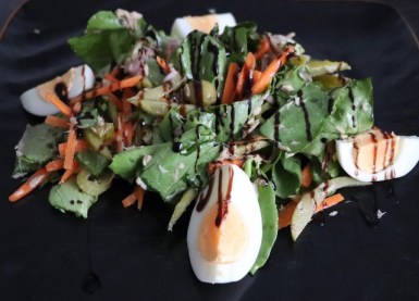 Salat auf den Tellern verteilen und mit geviertelten Eiern garnieren. Zum Schluss mit Balsamico Cremen das Salat bespritzen. Dieser Salat ist sehr lecker und erfrischend mit eine leichte süßsaure Note. Guten Appetit!