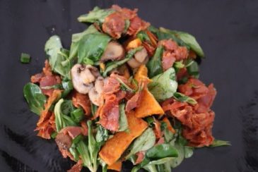 Frühlingszwiebel klein hacken und zusammen mit Feldsalat in einer Salatschüssel legen. Champignon/Chorizo und süße Kartoffeln dazu geben.