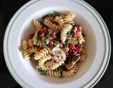 Zutaten: 500 g Farfalle, 2 EL Sonnenblumenöl, 1 Bund Lauchzwiebeln (4 Stück), 2 Rote Paprika, 250 g Braune Champignons, 1 Zwiebel, 1 Dose Rote Kidneybohnen 400g, 1 Dose weiße Kidneybohnen 400g, etwas Schnittlauchröllchen zum Garnieren, Salz, Schwarzer Pfeffer