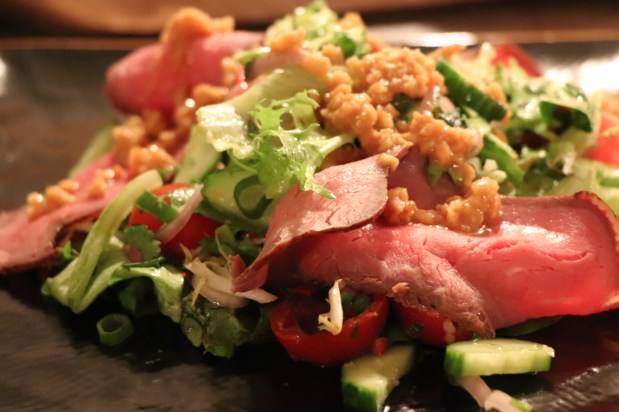 Gurkenmischung mit Salatblättern gut mischen. Mit Salz abschmecken und Salatdressing dazugeben. Erneut gut mischen. Wenn nötig erneut mit Salz und Pfeffer abschmecken. Den Salat auf Tellern verteilen und Roastbeef Fleischstreifen darüber legen. Erdnusssauce auf dem Fleisch verteilen und servieren. Das leicht säuriger Salatgeschmack wird von der Erdnusssauce und Roastbeef sehr gut ausgeglichen und schmeckt sehr lecker.