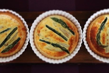 In einer Schüssel Ei mit Crème fraîche zusammen rühren, mit Salz und Pfeffer abschmecken. Spargel in den Förmchen legen und mit Crème fraîche überziehen. Tartelettes im Offen ca. 20 Minuten backen.