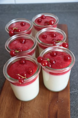 Johannisbeeren ohne Rispen und 20 g Zucker mit dem Mixer pürieren und sieben. Johannisbeeren-Püree mit dem Löffel auf Panna Cottas verteilen und mit Johannisbeeren garnieren.