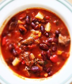 1,3 kg Rinder Beinscheiben, 2 Dosen geschälte Tomaten je ca. 800 g, Passierte Tomaten 700 ml, 4 Zwiebeln, 3 Möhren, Bund Petersilie, 1/3 Sellerieknolle, Süße Paprika 2 – 3 Stück, 1 Glas Rote Bohne (getrocknet), 1 EL Olivenöl, Salz, Pfeffer, 6 Lorbeerblatt, 1 EL Sambal Oelek, 1 TL Cumin, 2 TL Oregano (getrocknet).
