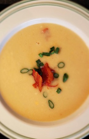 Servieren mit knusprigem Bacon und Schnittlauch. Diese Suppe eignet sich gut als Starter.